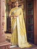 Elevate your festive wardrobe with this sandstorm yellow color saree crafted in art silk. Decorated using woven patterns all over, showcasing distinstive borders and pallu. Comes with a matching yellow color blouse in art silk. Note: The accessories featured are purely for fashion purposes. Due to photography reasons, some color variations may occur. The un-stitched blouse may be customized up to 42 inches.
